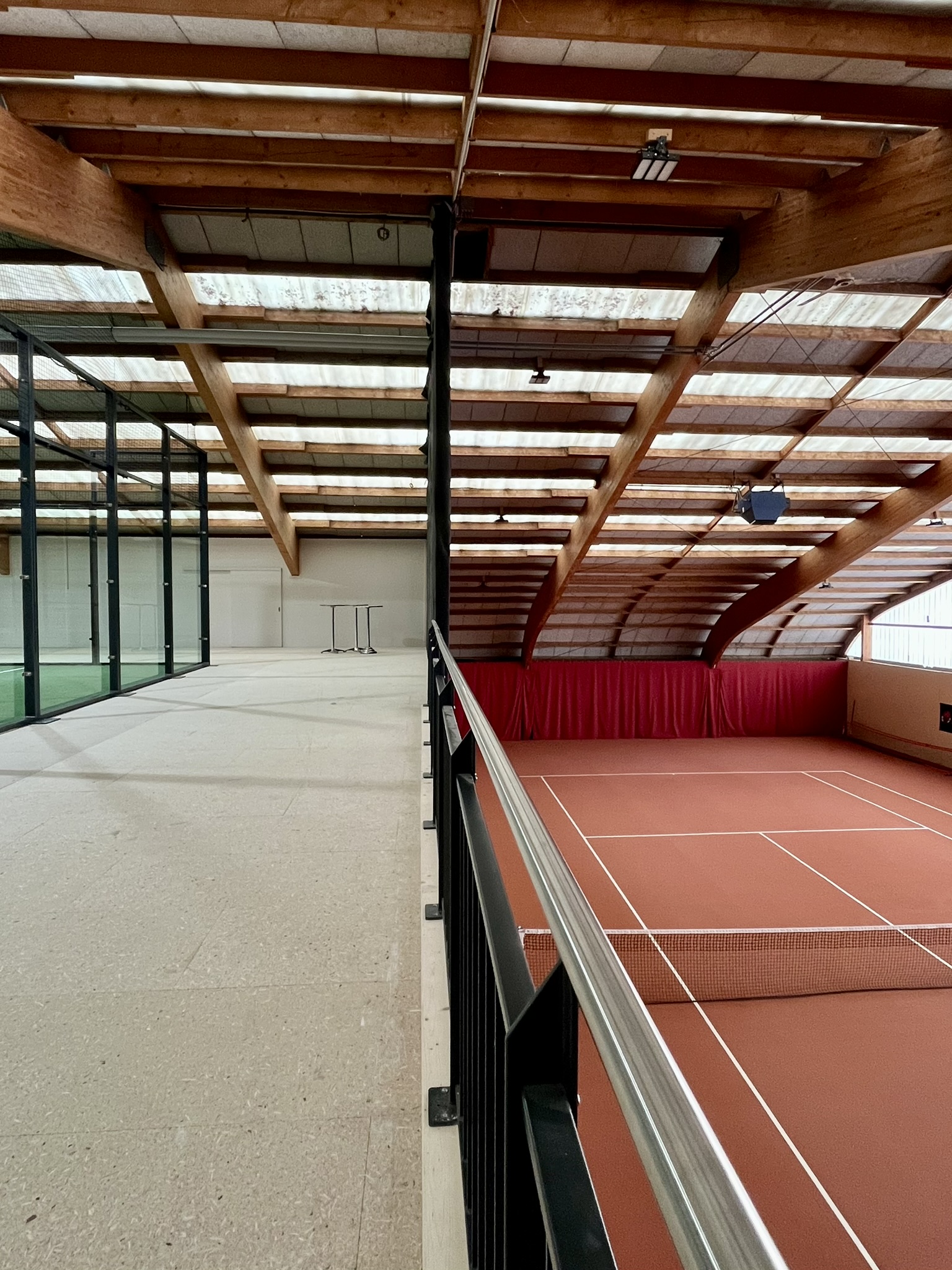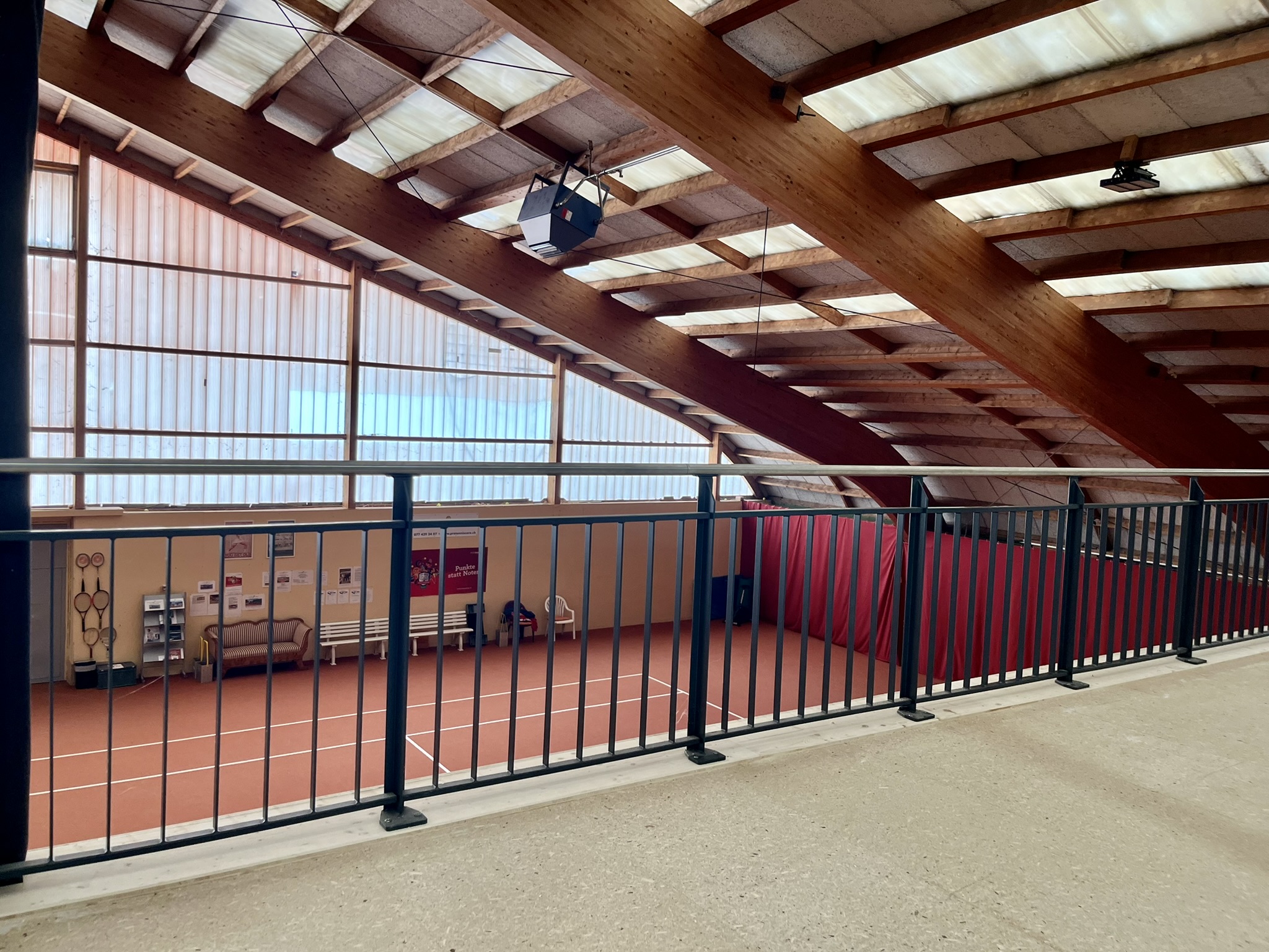 Ein offenes Geländer ersetzt die frühere Trennwand und schafft einen direkten Sichtbezug zwischen Dachstock und Erdgeschoss. Dadurch entsteht eine visuelle Verbindung zu den Tennisplätzen, die den Sportbereich offener und kommunikativer wirken lässt.