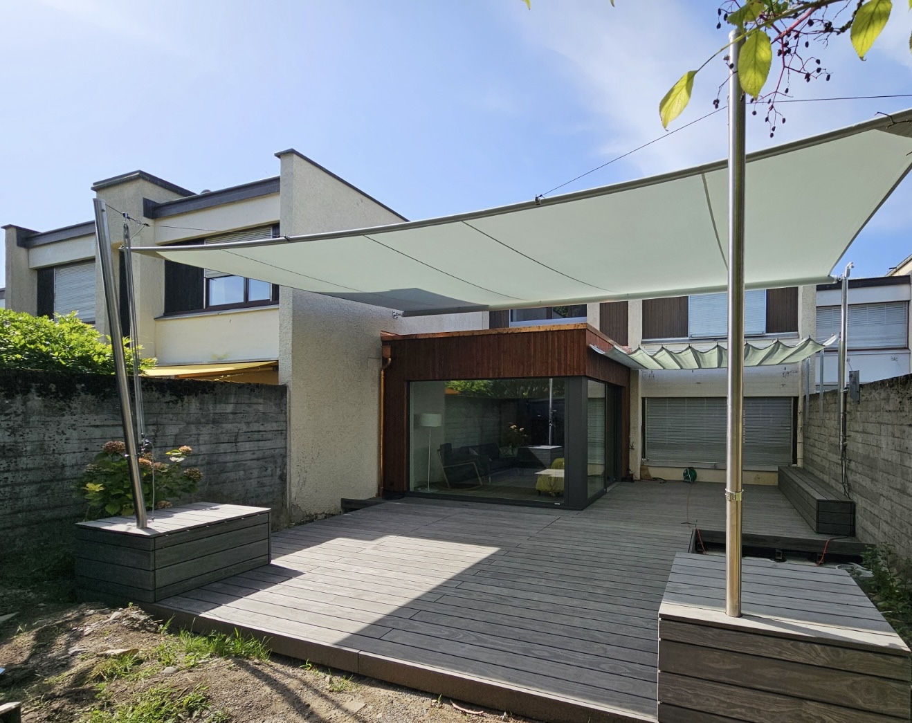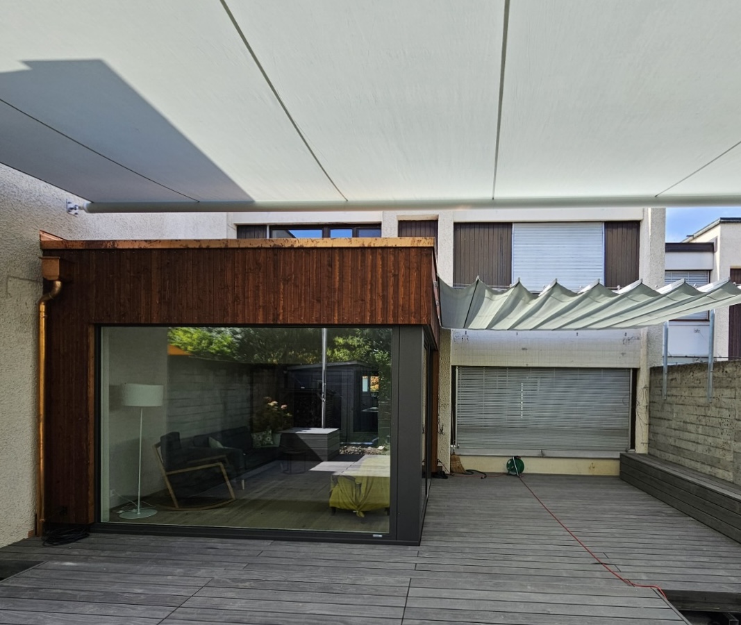 Der bestehende Wintergarten mit angrenzender Terrasse entsprach nicht mehr den heutigen Ansprüchen und wurde daher durch einen modernen Neubau ersetzt. Die neue Struktur wurde vollständig in nachhaltiger Holzbauweise realisiert und fügt sich durch ihre vertikale Holzlattung harmonisch in die bestehende Architektur ein.